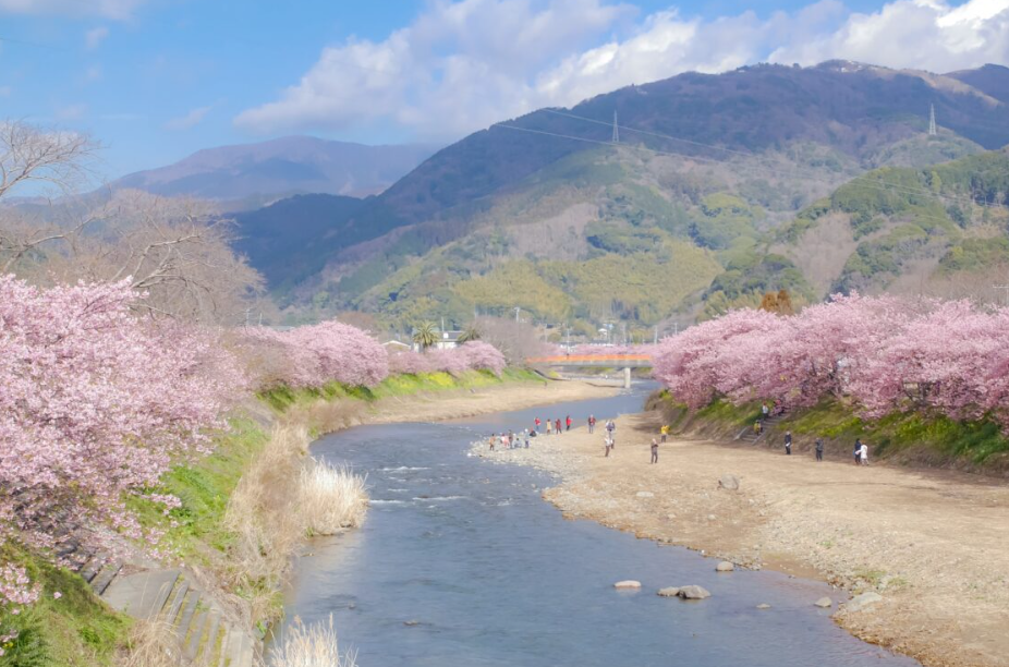 큰 꽃잎이 있고 비교적 진한 분홍색을 띠는 특징이 있는데요. 가와즈 강가에서는 가와즈 벚꽃 축제가 2월 초순부터 3월 초순까지 개최되어 매년 수백만 명의 관광객이 방문합니다. 강변에 피는 약 800그루의 벚꽃이 볼거리입니다.