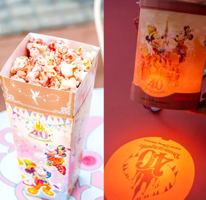 테마파크에 들어서면 달콤함 냄새로 유혹되어 구매하게 되는 대표적인 음식 중 하나인 팝콘. 40주년 스페셜 메뉴로, 치즈 맛에 베리를 더한 베리 치즈 케이크를 모티브로 한 맛이 출시됩니다. 팝콘 바구니도 40주년 스페셜 버전으로, 로고 마크를 투영할 수 있는 기능이 달려 있어서, 빛나는 로고와 밤의 테마파크를 함께 걷게 되면 더 화려한 분위기를 느낄 수 있습니다.