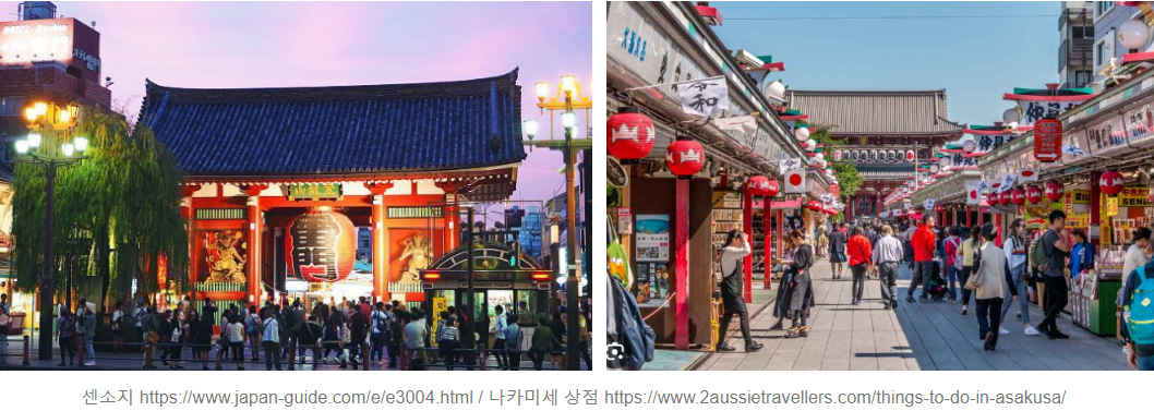 센소지는 일본에서 가장 오래된 사원 중 하나로, 아름다운 산다이몬(대문)으로 유명하며, 이곳을 지나면 나카미세 상점가가 펼쳐지는데 전통적인 공예품, 음식, 기념품 등 다양한 일본을 대표하는 물건 및 먹거리를 즐길 수 있습니다. 쇼핑을 즐기면서 일본의 전통 문화도 경험할 수 있죠.