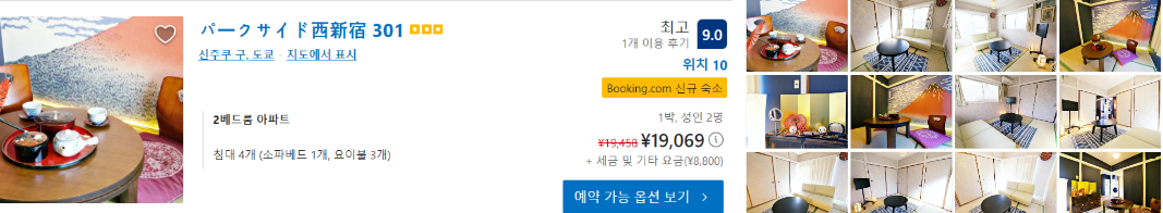 ●신주쿠 최고평점 + 최저가 호텔:파크사이드 니시신주쿠 301 / 19,069원(금요일 1박)
