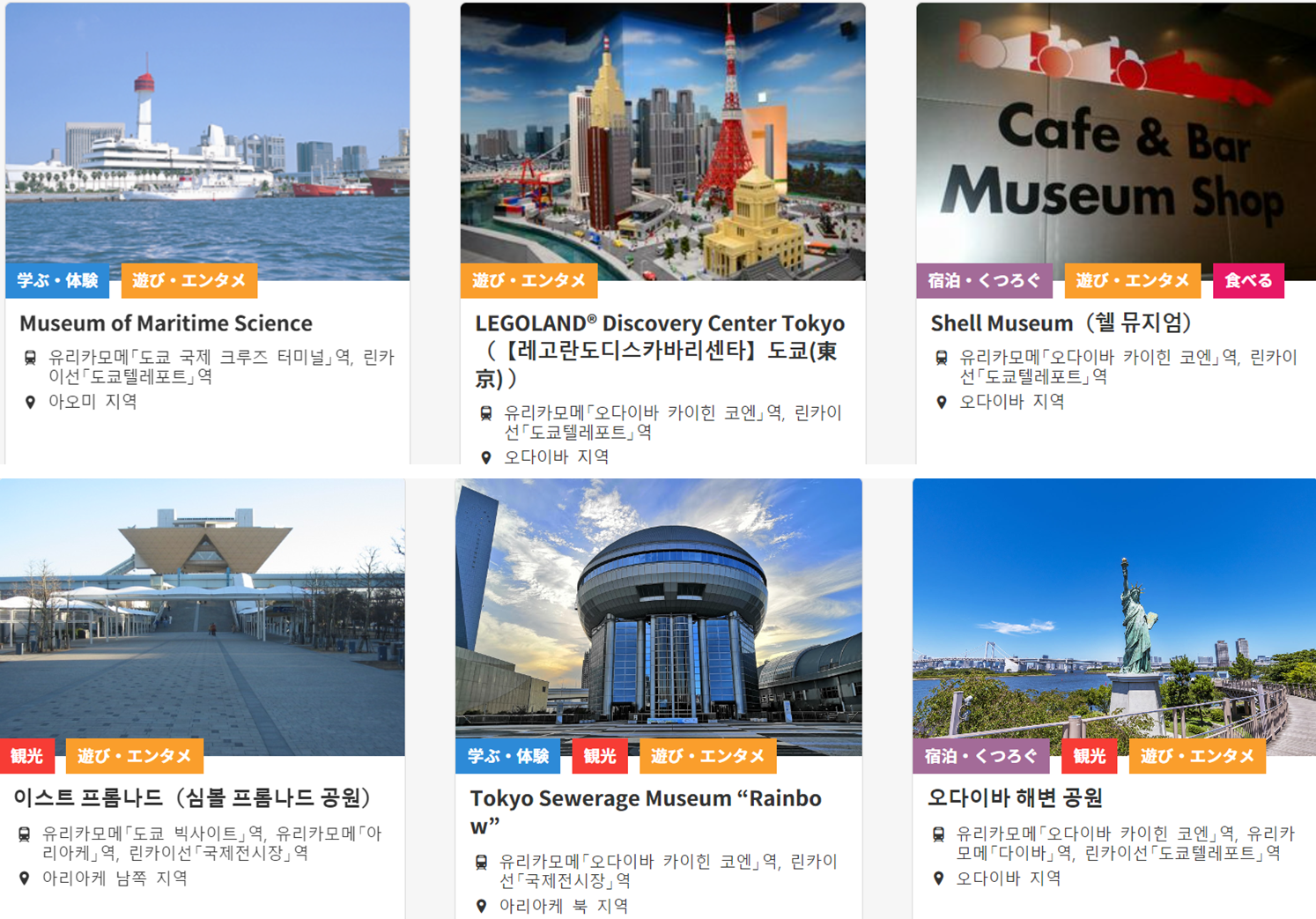 다양한 엔터테인먼트 시설과 명소들을 즐길 수 있는 곳이기 때문에 매년 수많은 관광객들이 방문하고 있습니다. 도쿄에서 가장 가까운 해변이기도한 오다이바 해변에서 도쿄의 아름다운 경치와 산책, 해상 크루즈 등 다양한 야외 활동도 즐길 수 있습니다.
