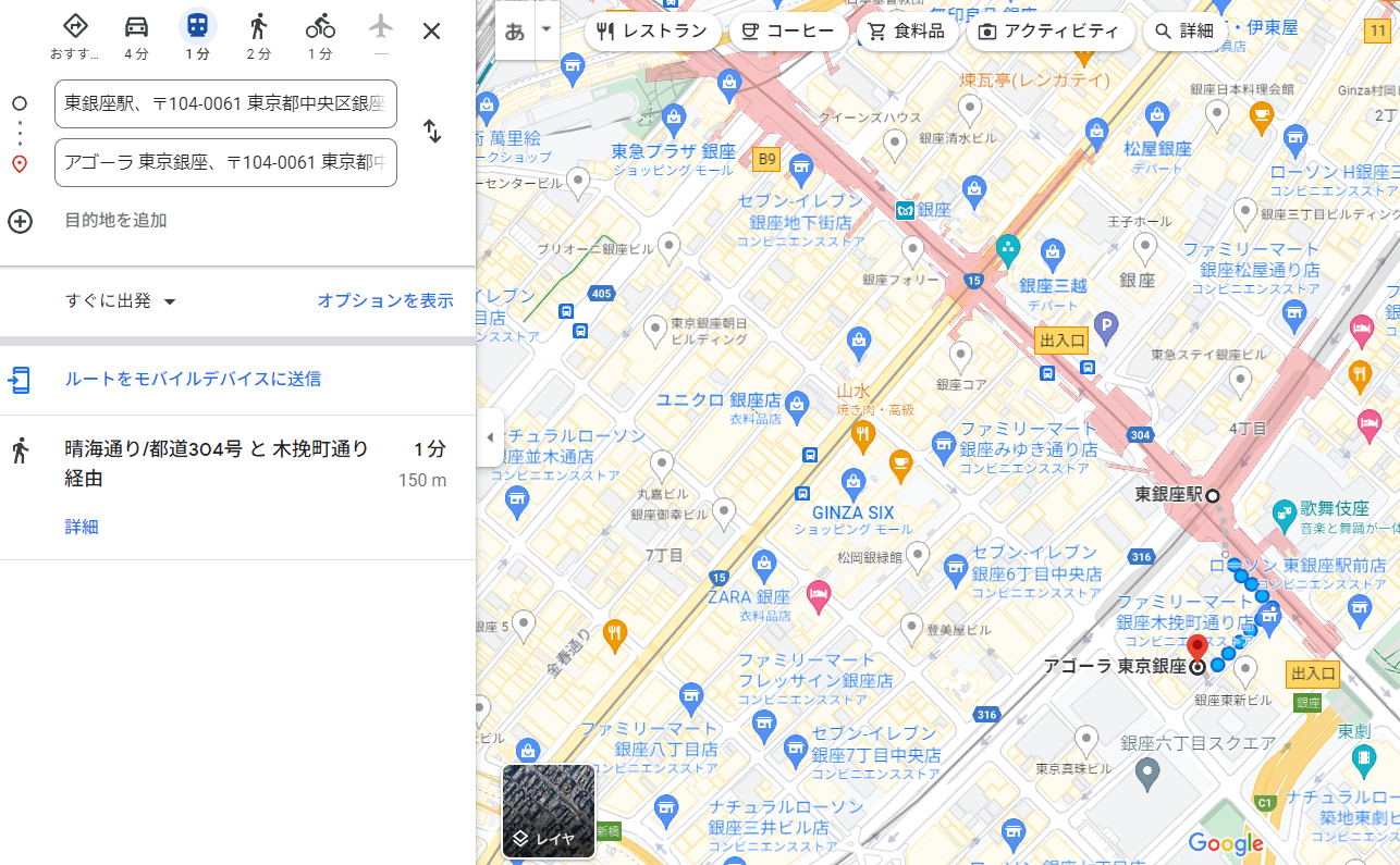 〇긴자 중심지까지 거리(★★★★★): 중심지에 위치