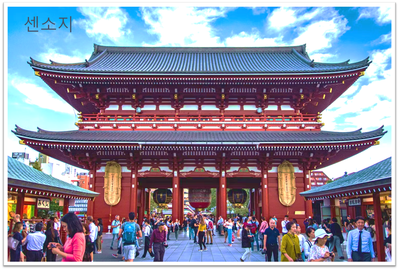 센소지는 사원에 들어가기 전부터 그 매력을 느낄 수 있는데, "카미나리몬"이라고 불리는 두 개의 큰 붉은 문을 통과하고 "나카미세"라고 불리는 200미터 길이의 상점가를 거쳐 사원으로 향하게 되기 때문에 사원을 향해 가는 동안에 이곳을 대표하는 볼거리와 먹거리를 경험할 수 있습니다.
