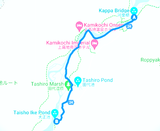 카미코치는 여름 더위를 피해 휴가를 즐기기에 매우 인기 있는 곳입니다. 타이쇼 연못은 산과 숲으로 둘러싸여 있고, 맑은 물에 비친 숨막히는 풍경이 정말 감동적이라고 합니다. 100년 전 야케산의 분화로 하룻밤에 만들어진 것인데요. 가장 대표적인 하이킹 코스는 카파 다리에서 출발하여 타이쇼 연못까지 걷는 코스인데 약 80분 정도 소요되며, 편도로 약 4km 정도입니다.