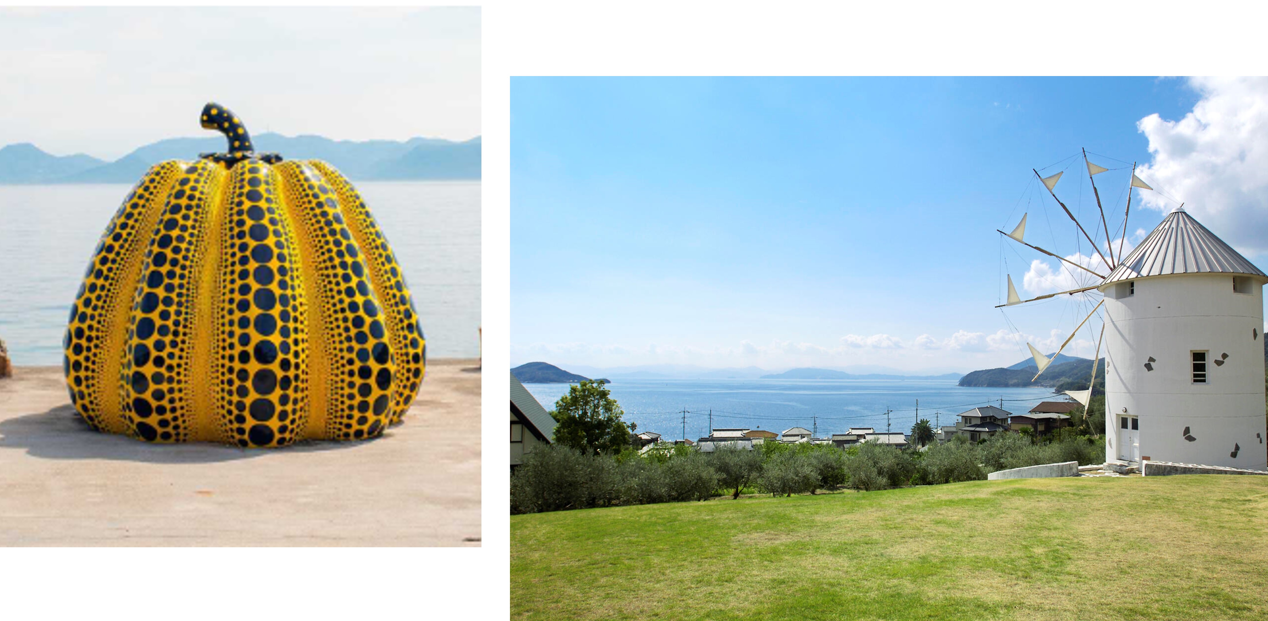 섬 곳곳에서 발견할 수 있는 예술작품도 매우 유명한 독특한 관광명소로 알려져 있습니다. 세토우치 국제 미술제(세토우치 트리엔날레)의 메인 장소 중 하나이며, 3년마다 개최되는데 야외에 전시된 작품들과 함께 자연의 경치와 조화과 매우 아름다워 관광객이 많이 방문하는 곳입니다.