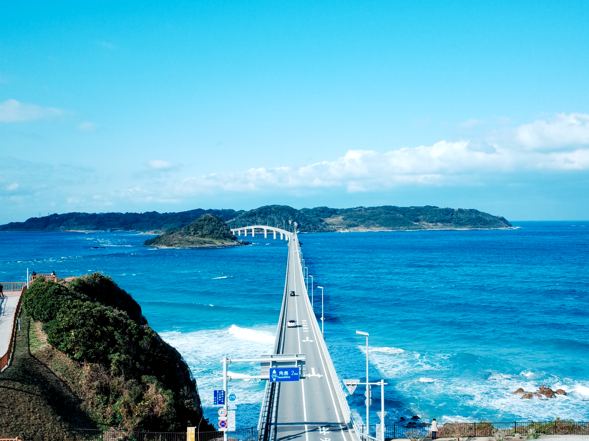 다리 전체를 감상하고 싶다면, 시모노세키시에 위치한 아마카제 공원에 주차하시면 좋은데요. 거대한 다리와 에메랄드 그린 색상의 바다를 풍경을 감상할 수 있습니다. 인공다리이지만 주변 환경과 완벽하게 어울린 모습이라고 찬사를 받는다고 하네요.