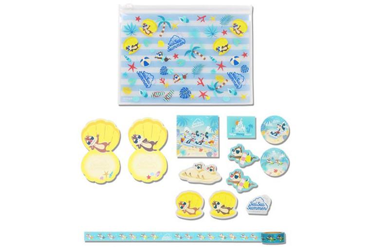 여름을 즐기는 팁 앤 테일. 컬러풀한 슬라이드 지퍼 케이스와 스티커, 메모지, 마스킹 테이프가 포함된 고급스러운 디즈니 문구 세트입니다.